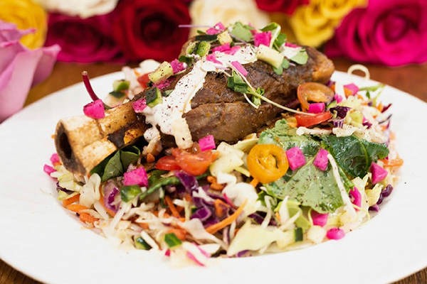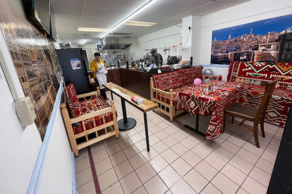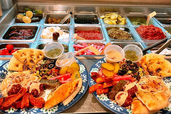 Our cuisine highlights classic ingredients: tomatoes, cucumbers, pickles, Mediterranean salad, tahini, herbs, and warm flatbreadYemeni Tradition