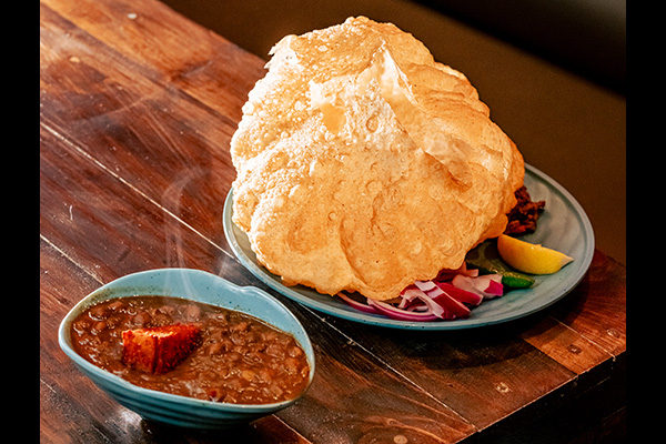Spiced chickpeas served with deep-fried bread - a perfect combo!