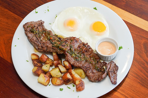 Peruvian Style Marinated Halal Free-Range All Natural Chicken Served W/ Fries, Mix Green Salad and Aji de Polleria Sauce.MEXICAN-STYLE STEAK AND EGGS $26