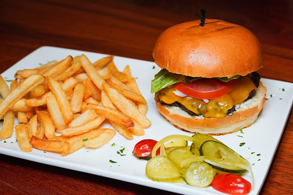 Stir-fried beef tenderloin flamed with pisco, soy sauce & red wine, sautéed onions & tomatoes; served with jasmine rice & French fries.MAYAFLOR BURGER $20