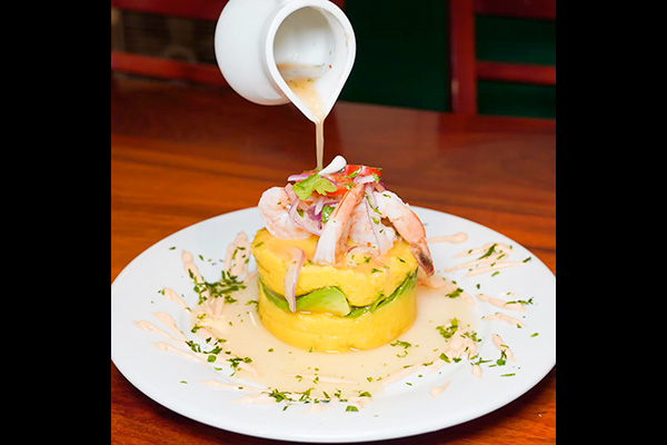 Chicken salad , golden potatoes, aji Amarillo aioli.CAUSA DE CAMARON $20
